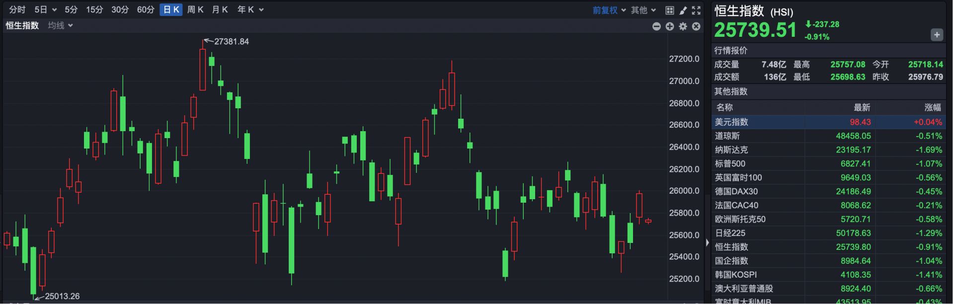 截至发稿,恒生指数报25739点,下跌237点,跌幅0.91%。