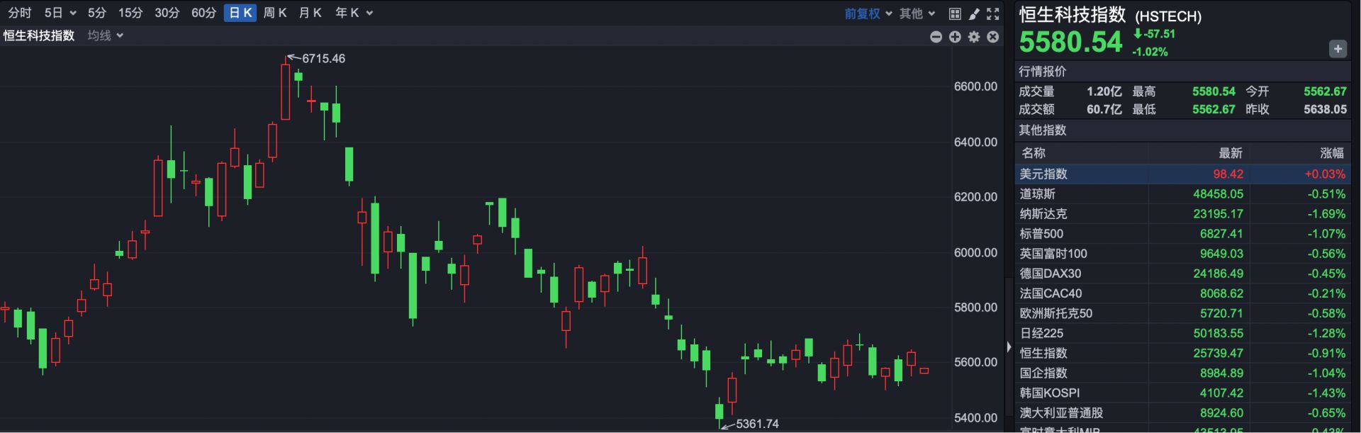 恒生科技指数报5580点,下跌57点,跌幅1.02%。