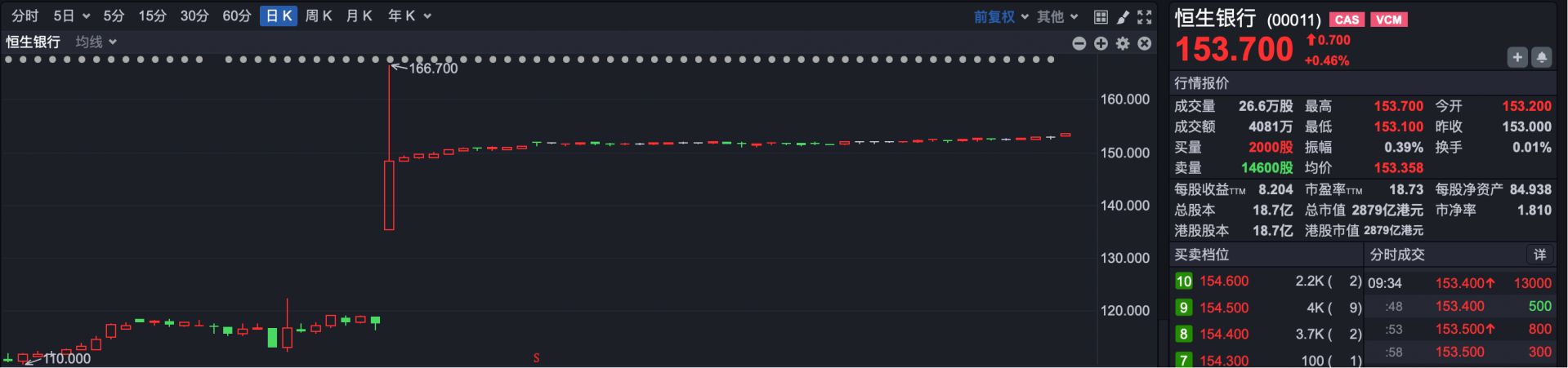 截至发稿,恒生银行报153.7港元,股价小幅上涨0.46%。
