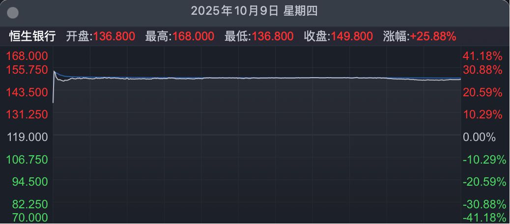 公告之前,恒生银行股价报收于117.7港元,公告当天盘中,恒生银行股价最高涨至166.7港元,盘中最大涨幅高达41%。而10月9日以来,恒生银行股价一直维持在150港元之上横盘。