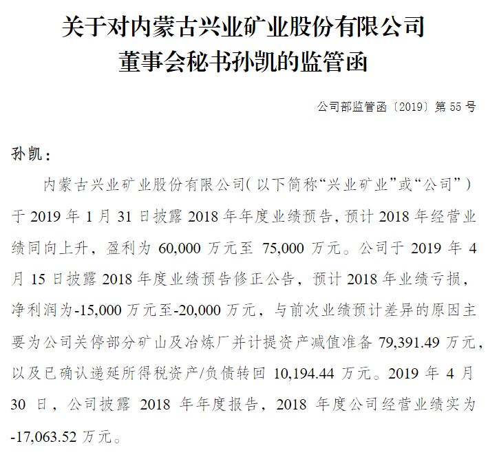2019年以来,兴业银锡多次收到监管函,其中一次就是针对董事会秘书孙凯。兴业银锡2019年8月30日监管函显示,由于2018年业绩预告出现大幅修正,但公司没有就相关的风险进行充分提示,而作为公司董事会秘书的孙凯,应当对上市公司业绩修正滞后行为负有责任。