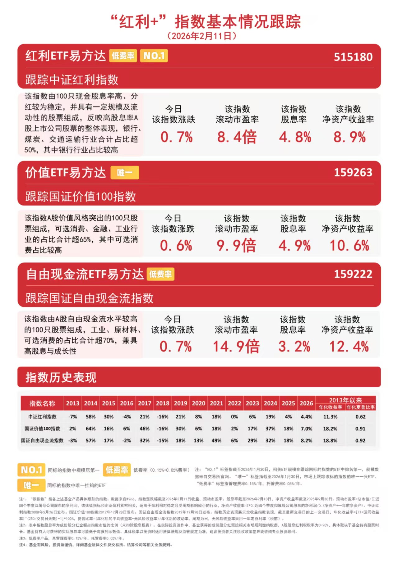 国证价值100指数采用“高分红+高自由现金流+低市盈率”三维筛选体系,优选价值标的,历史表现稳??;国证自由现金流指数则采用自由现金流率进行选样,兼具高股息与成长性。价值ETF易方达(159263)和自由现金流ETF易方达(159222)分别跟踪以上指数,可助力投资者把握相关风格投资机遇。