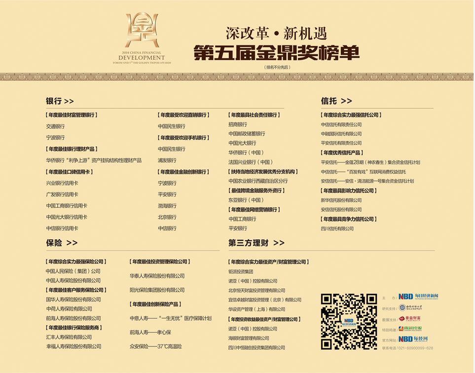 由《每日经济新闻》主办的一年一度的“2014中国金融发展论坛暨第五届金鼎奖荣誉盛典”活动即将拉开帷幕,本次活动以“深改革?新机遇”为主题, 从财富管理的角度关注金融业的发展新趋势。本次金鼎奖活动作为《每日经济新闻》年度大型金融行业活动,已经成功举办四届,均获得圆满成功,得到了行业内各大金融机构的关注和认可。